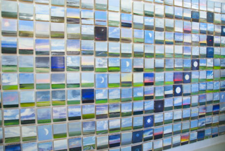 Mijn installatie ‘Zon Maan Wolken’ met 365 wolkenluchten is op een speciaal verhoogde muur in zijn geheel op een wand te zien.